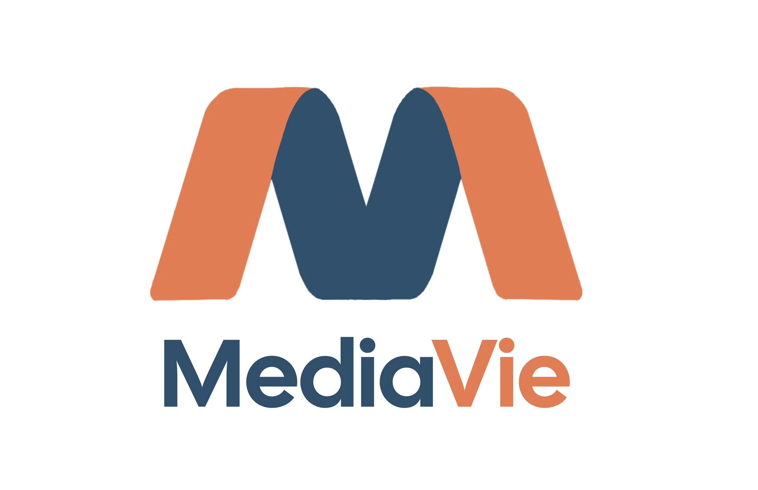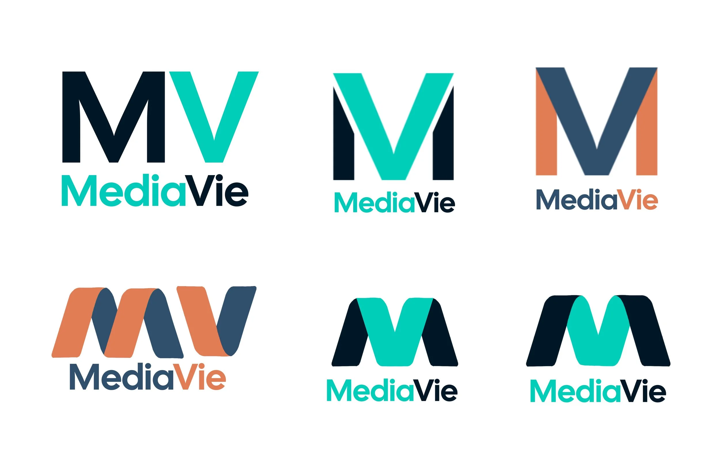 For this second set of logos, I went with the name “MediaVie”—with “Vie” meaning “life” in French. The idea was to represent the class as a space centered around all things media, almost like it has a life of its own. In this logo, and some versions (seen below), the “M” and “V” are merged into a single mark to emphasize the connection between media and life. I carefully chose the color palette to reflect the brand’s personality: orange for warmth and energy; blue for clarity and calm; teal for creativity and freshness; and a deep navy for elegance and modernity.